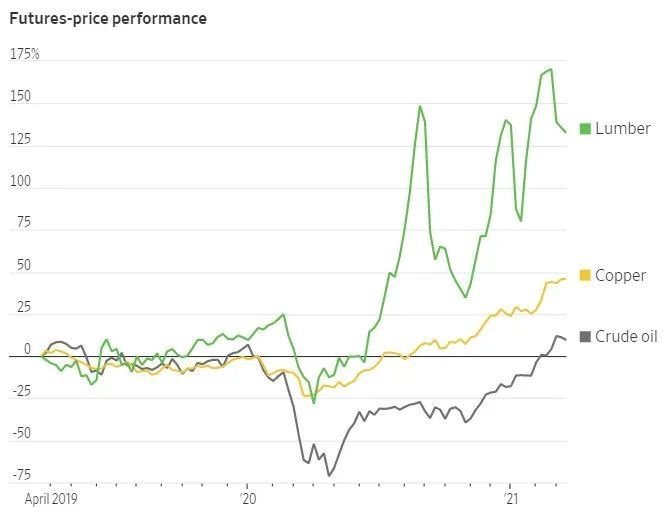 全美房屋建設(shè)原材料價格快速上漲。木材是繼土地和勞動力之后房屋建設(shè)的最大成本之一,其價格從未像現(xiàn)在這樣昂貴,典型木材價格與去年同期相比翻了兩倍。自十月份以來,作為油漆、排水管、屋頂板瓦和復(fù)合地板原材料的原油價格暴漲了80%以上。在整個房屋中的水管和電線原材料---銅,其價格比秋季高出約三分之一。