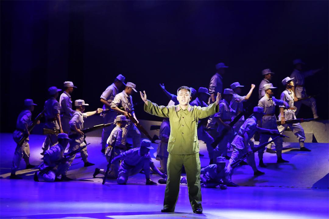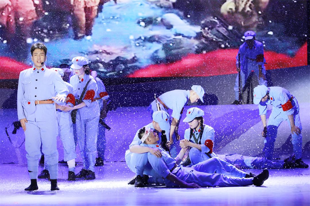 演出分為“烽火歲月”“忠誠使命”“強軍征程”三個篇章,共12個節(jié)目。開篇情景劇《山河銘記》以震撼的舞臺效果,再現(xiàn)了抗戰(zhàn)時期中華兒女浴血奮戰(zhàn)的壯烈場景;紅歌聯(lián)唱《三灣來了毛委員》《八月桂花遍地開》用經(jīng)典旋律喚起紅色記憶;男子群舞《為你站崗》以剛勁有力的舞姿,展現(xiàn)了高原官兵的堅守與擔(dān)當。